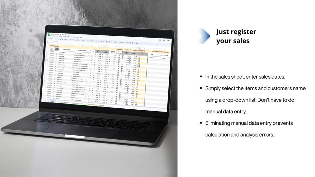Why Choose Our Spreadsheet: - Streamline your sales data management. - Make data-driven decisions to grow your business. - Visualize sales trends and set achievable goals. - Improve cost analysis and profitability. - User-friendly interface, no advanced Excel skills required.